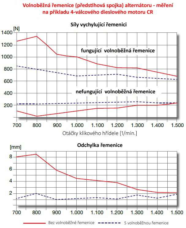 PRÍČINA: zadretie voľnobežnej remenice alternátora. Voľnobežná remenica, zvaná tiež predstihová spojka alternátora, využívaná v pohone drážkového remeňa tlmí vibrácie motora. Ak dôjde k zadretiu voľnobežnej remenice alternátora, vibrácie sú tlmené. V dôsledku čoho je pri voľnobežných otáčkach alebo otáčkach okolo 1.400 ot / min chod remeňa nerovnomerný a vibrácie remeňa nadmerne zaťažujú napinák. Už po krátkom čase chodu pri takých podmienkach zadretá voľnobežná remenice alternátora spôsobí poškodenie napínača, tak aj drážkového remeňa. Za určitých podmienok môže dôjsť k úplnému zničeniu motora.