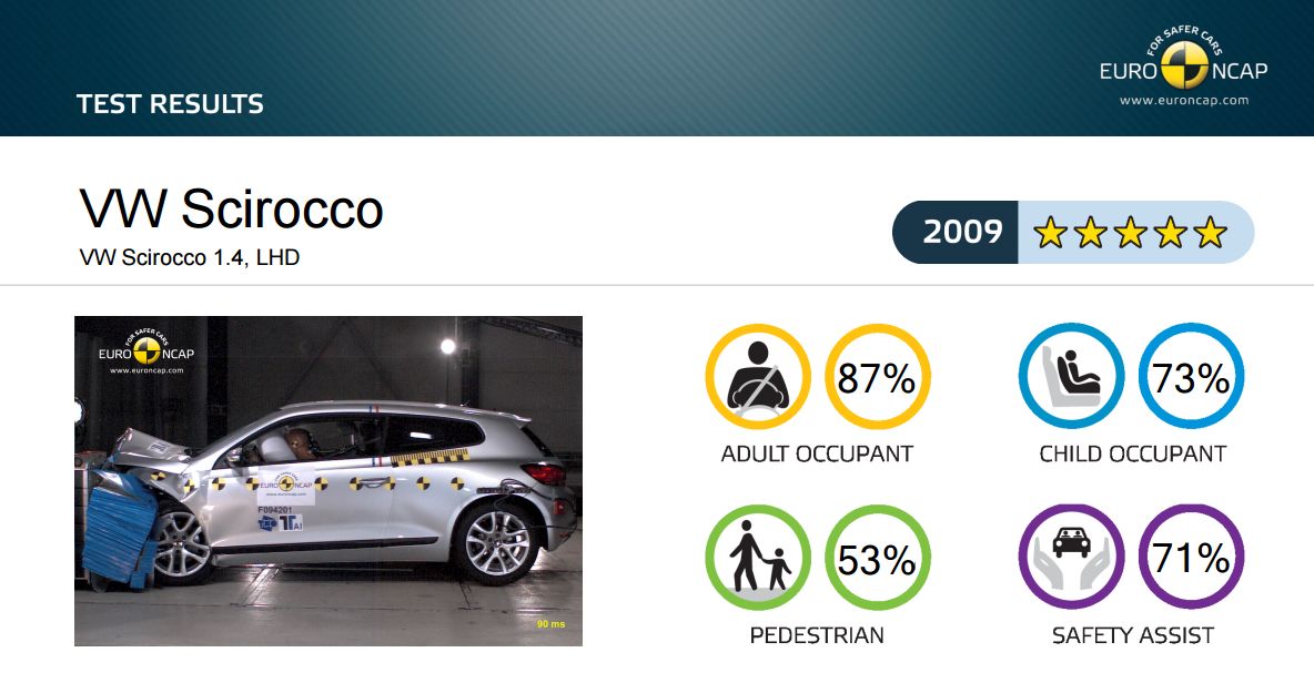Technici NCAP poslali Scirocco oproti bariéram v roku 2009. Testy dopadli na výbornú a športový Volkswagen si odniesol päť hviezd.